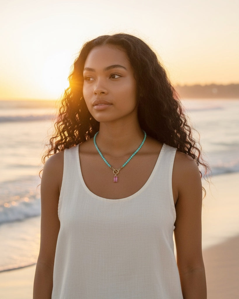 Natural light green amazonite, pink cz pendant & toggle clasp.