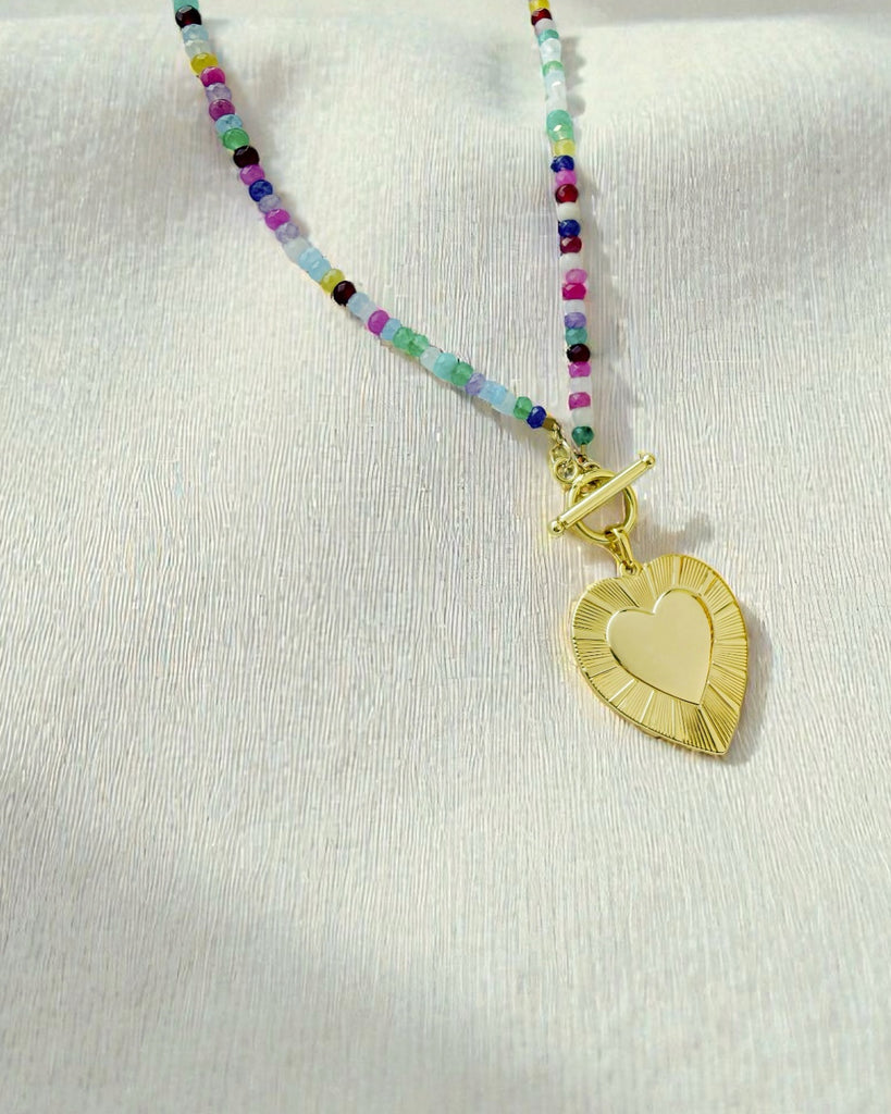 Genuine mixed gemstones, statement-sized gold-filled heart pendant & toggle clasp.