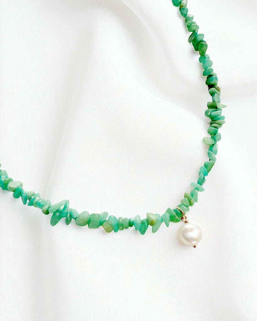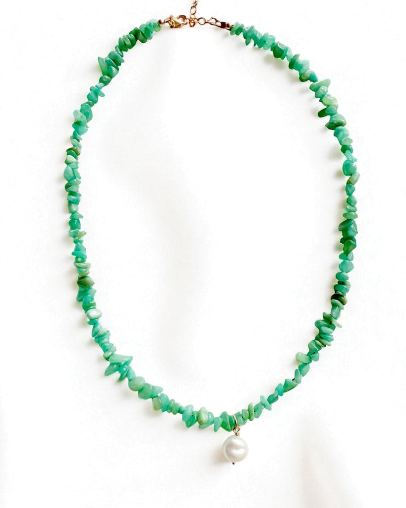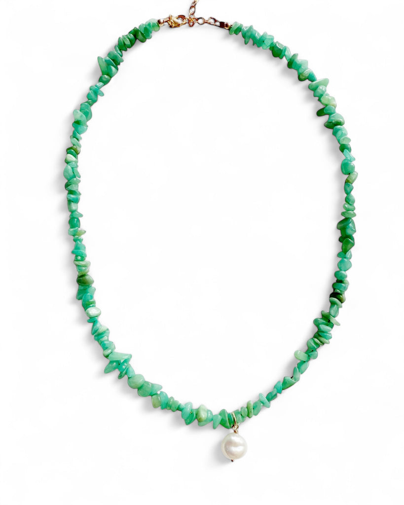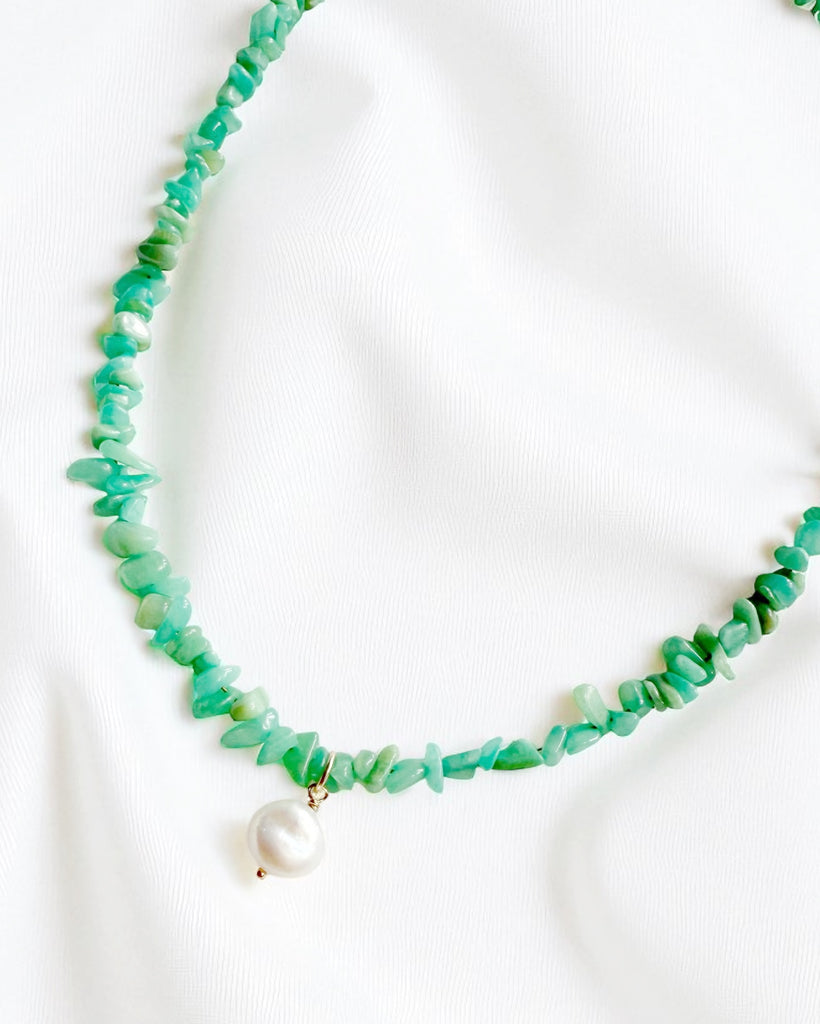 Genuine Peruvian amazonite and freshwater coin pearl; adjustable.