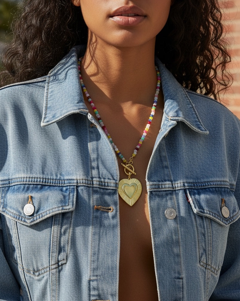 Genuine mixed gemstones, statement-sized gold-filled heart pendant & toggle clasp.