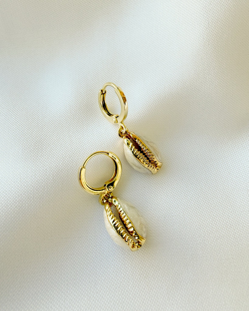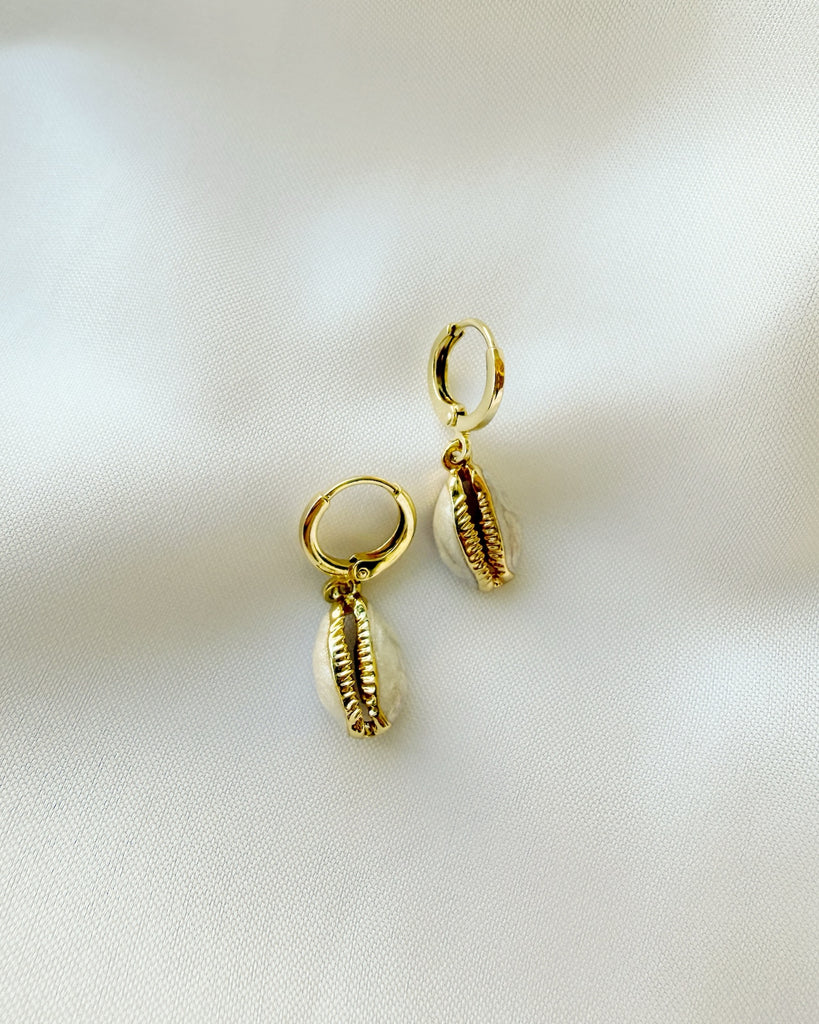 Gold-filled cowrie shell charms hang from huggie-style hoops. Lightweight.