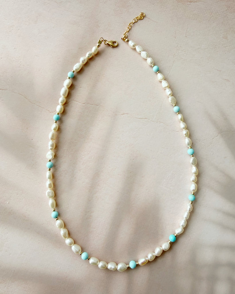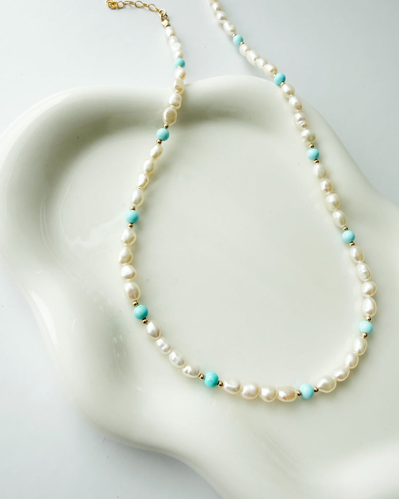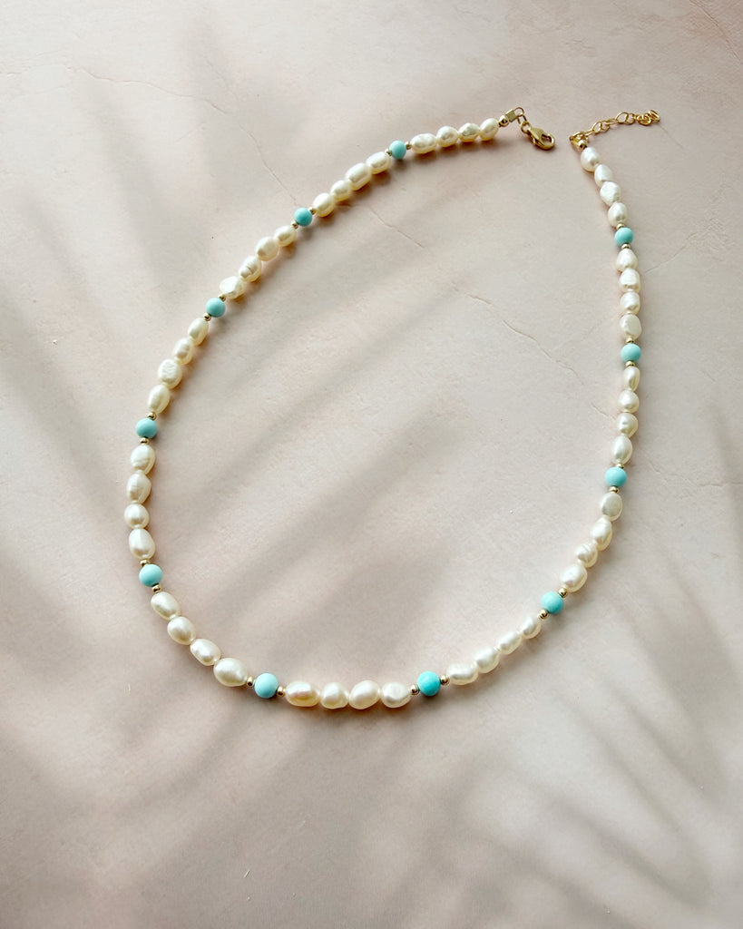 Genuine freshwater pearls, blue howlite, and high quality 14k gold-filled beads; adjustable.