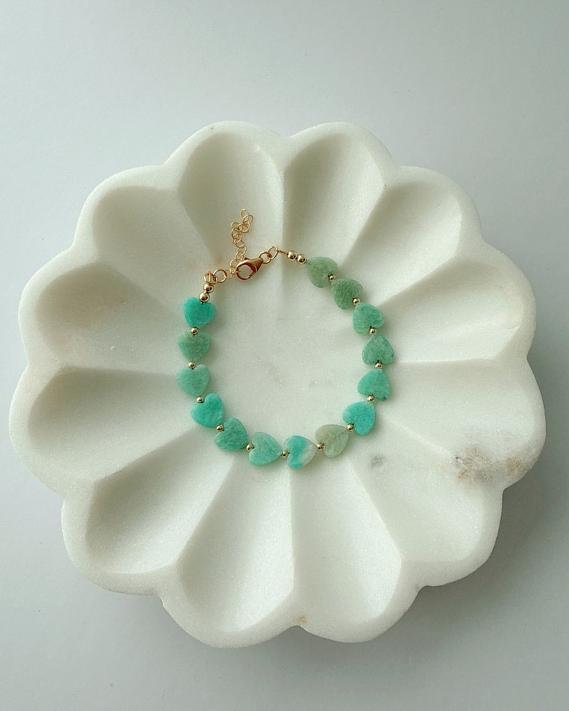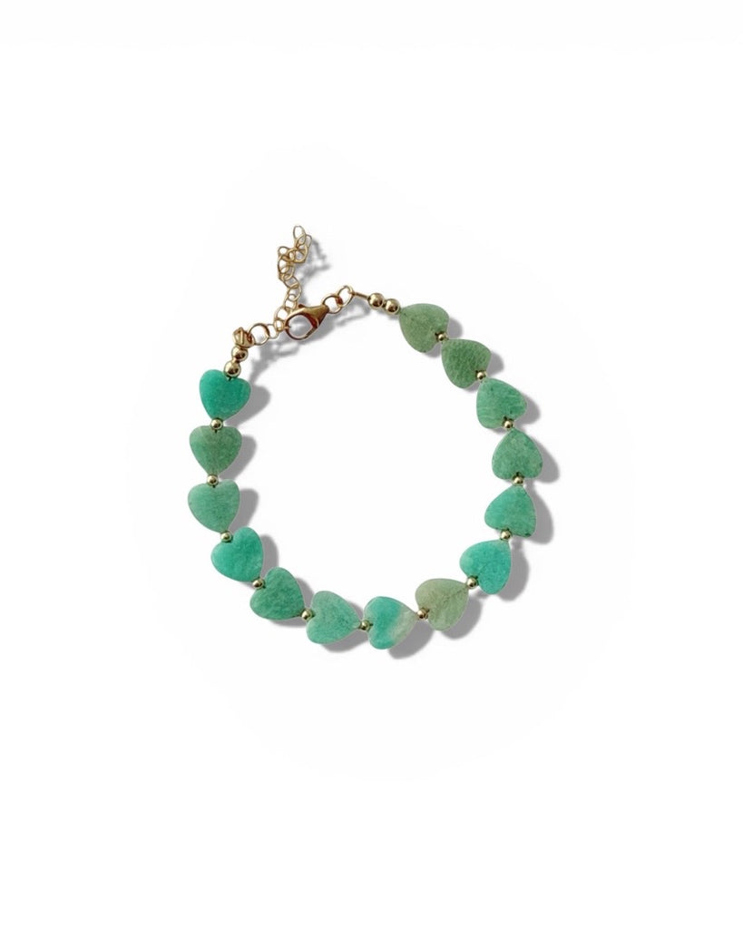 Genuine heart-shaped amazonite and 14k gold-filled beads; adjustable.